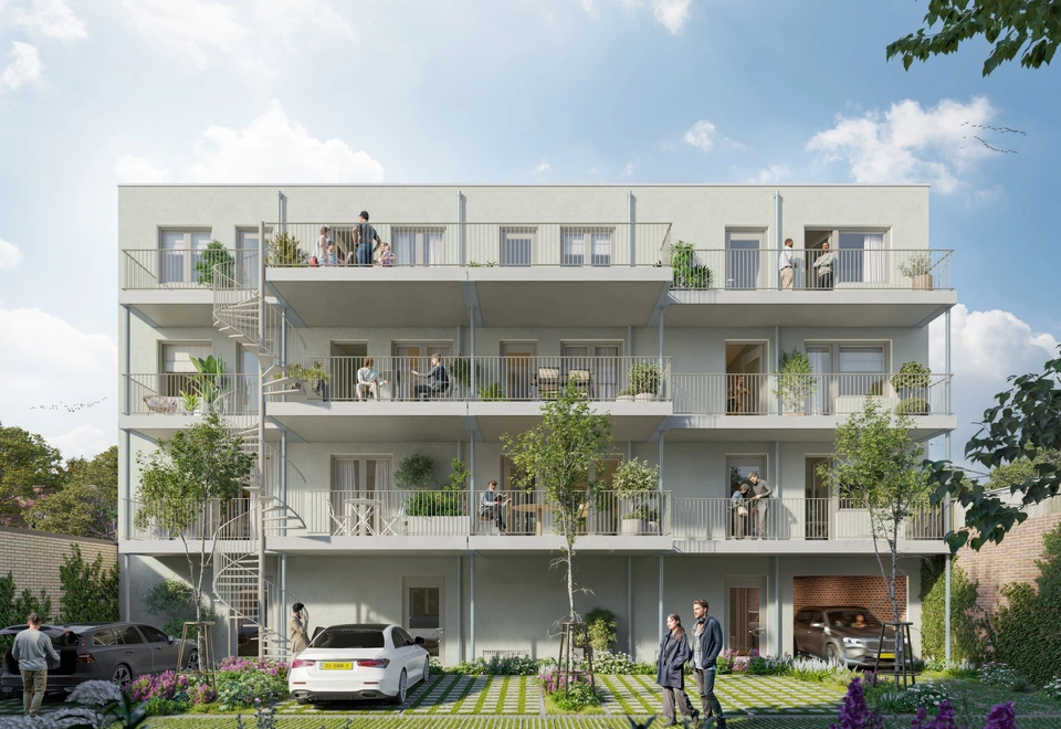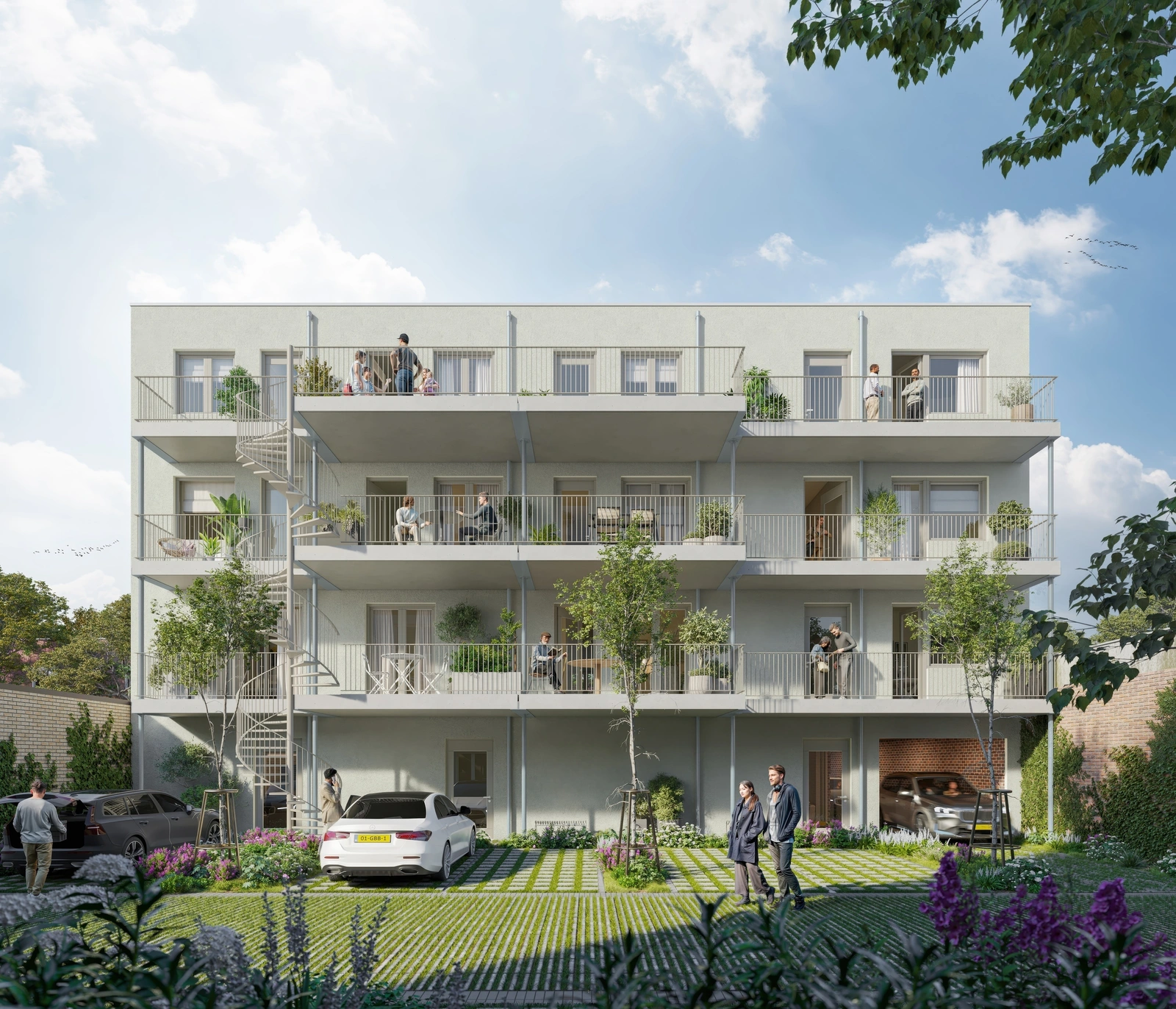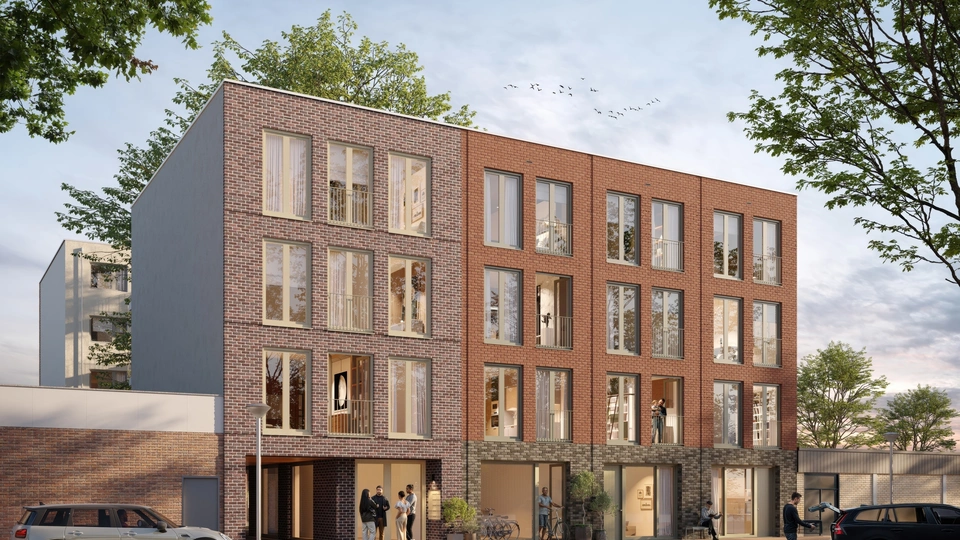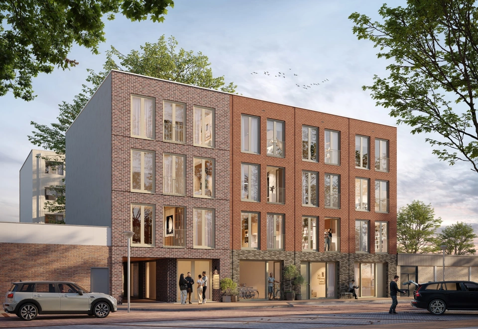 Baardmezenstraat: In contrast met het robuuste volume aan de Zuiderkade is het gevelbeeld aan de Baardmezenstraat opgebouwd uit kleinere, fijnmazige volumes die refereren aan het karakter van de traditionele woonstraat. Een reeks smalle panden met elk hun eigen identiteit. Slanke raamopeningen, verticale baksteenaccenten en subtiele repeterende gevelritmiek zorgen voor een elegant straatbeeld. De rechter panden zijn in plint en bovenbouw uitgevoerd in dezelfde warme baksteen als aan de Zuiderkade, met donkerdere voegen in kleur van het metselwerk. Het linker pand vormt een stevig contrapunt, met een donkere steen en lichte, voeg.