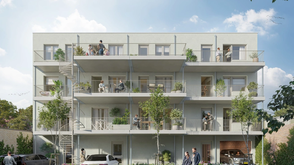 Zuiderkade: Het gevelbeeld aan de Zuiderkade is ontworpen als een samenhangend en ingetogen volume: een robuuste, architectonisch zelfstandige plint met daarboven een bovenbouw van vier verdiepingen. Voor de gevel is bewust gekozen voor rust en regelmaat. De herhaling van identieke gevelopeningen in een vaste cadans zorgt voor een evenwichtig en homogeen straatbeeld, passend binnen het beoogde karakter van de Zuiderkade als stedelijke woonstraat met een ingetogen architectonische uitstraling. Het gebouw wordt in deze opzet vormgegeven als één stevig woonvolume dat refereert aan het robuuste verleden van de Zuiderkade als overslagkade. De plasticiteit van de gevels is versterkt door toepassing van diepe neggen – in de plint en in de bovenbouw – wat zorgt voor duidelijke schaduwwerking en diepte. De horizontale banden tussen de raamopeningen liggen terug, wat zorgt voor een meer horizontale belijning in de gevel. De balkons zijn zorgvuldig geïntegreerd in de architectuur: voor de grijsbetonnen vloeren zijn transparante hekwerken geplaatst, wat het gebouw een pakhuisachtige uitstraling geeft, zonder dat de balkons te dominant ogen.